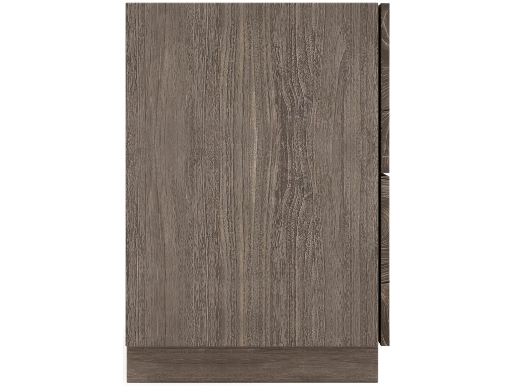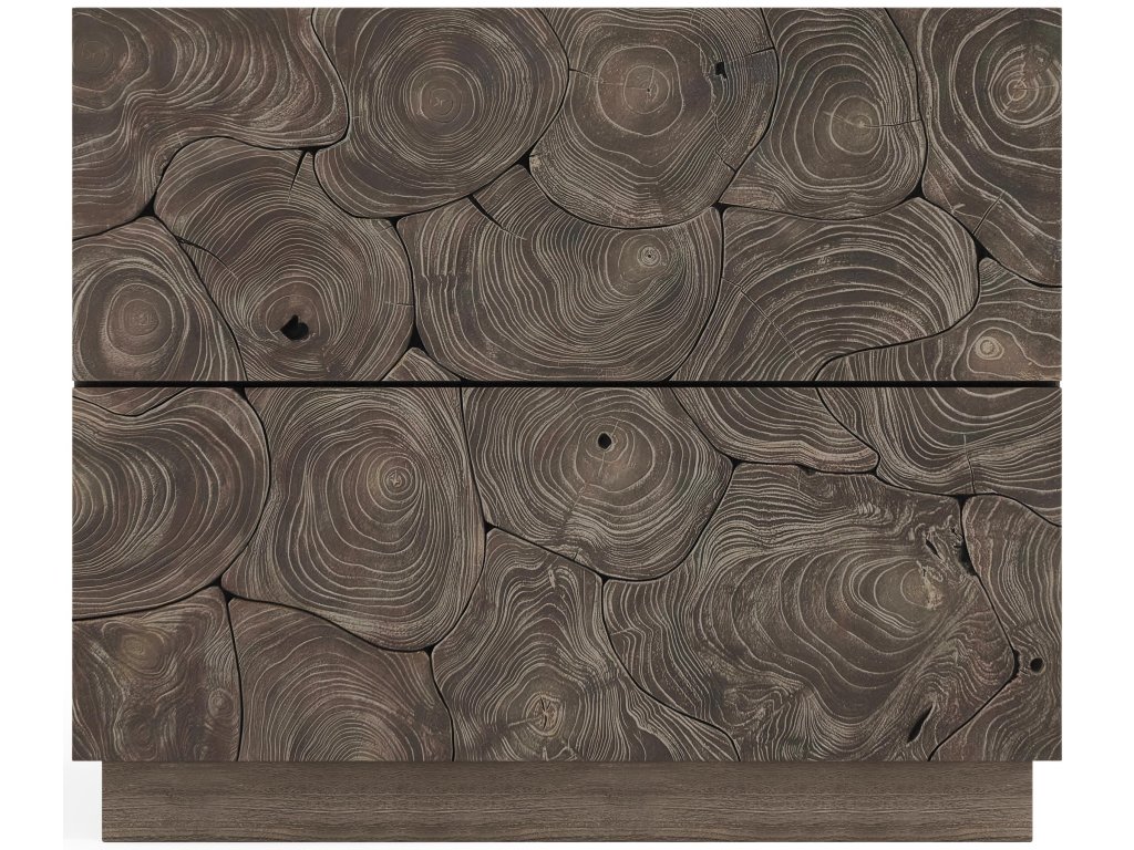 Product Description: A simple minimalist form combines with the beautiful organic texture of teak for the Calavaras nightstand. The design draws all eyes, with its open-work pattern of sliced teak on two push-to-open drawers. Finished in Smoked Truffle, the nightstand rests on a plinth base.