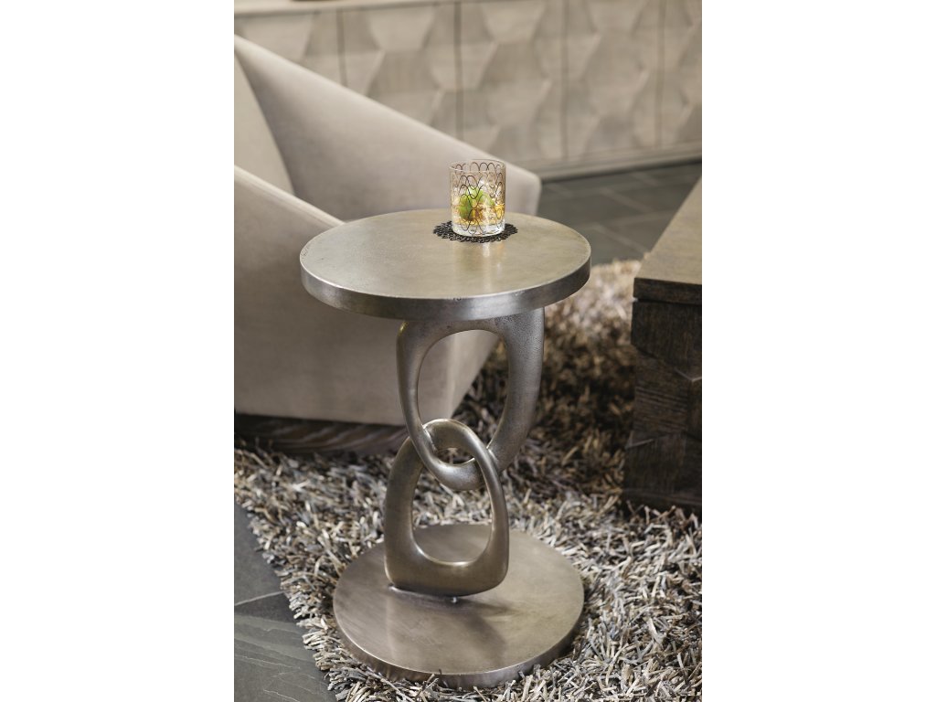 Product Description: Seeming to defy gravity, the Linea round chairside table showcases a sculptural pedestal formed by two interlocking rings with irregular shapes. The creative form feels light and airy, sleek and modern. Crafted from cast aluminum, it features a Textured Graphite finish obtained through a multi-step process. Combining dramatic flair with subtle textures, this piece offers a unique, sophisticated style.