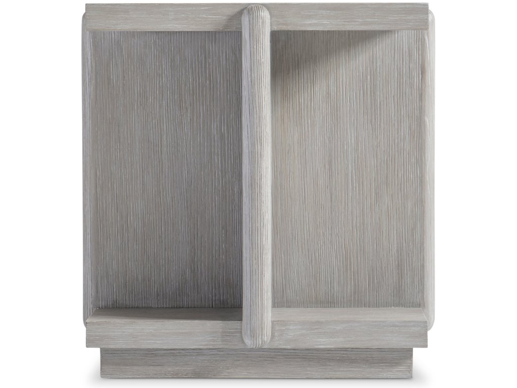 Product Description: The Sereno side table has a partitioned wood base that offers open storage. The center panels rise up to support and intersect with the wood top, all of which is featured in a textured Grigio finish. The result is a fresh perspective on modern rustic design.