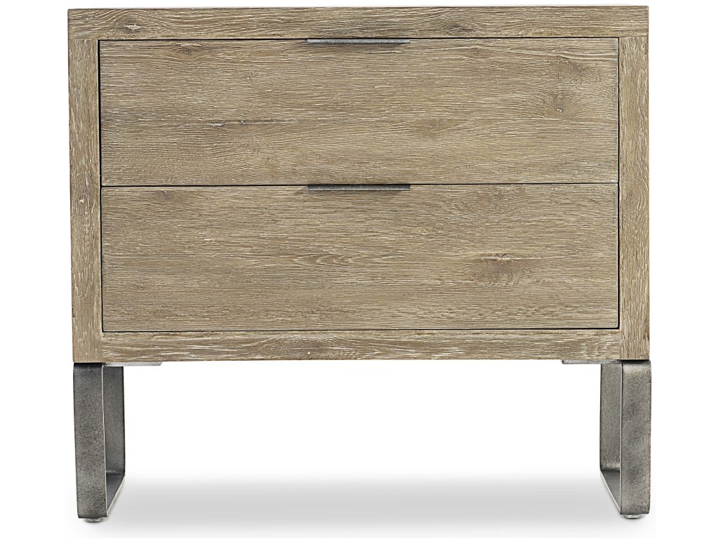 Product Description: Visible natural features of the wood add authenticity to the Tribeca nightstand in Aurum finish. Geometric shaping on the textured steel legs provides a contemporary touch. Each of the two drawers has a textured metal pull tab in Barlow finish. The design also includes a two-port USB charging unit.